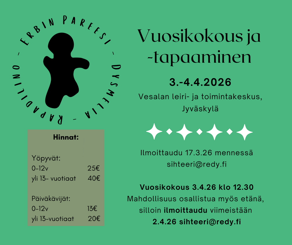 REDy ry tukee myös paikallistapaamisia, olethan siis matalalla kynnyksellä yhteydessä hallitukseen, mikäli toivot tukea esimerkiksi välipalatarjoiluun vertaistapaamisen yhteydessä.