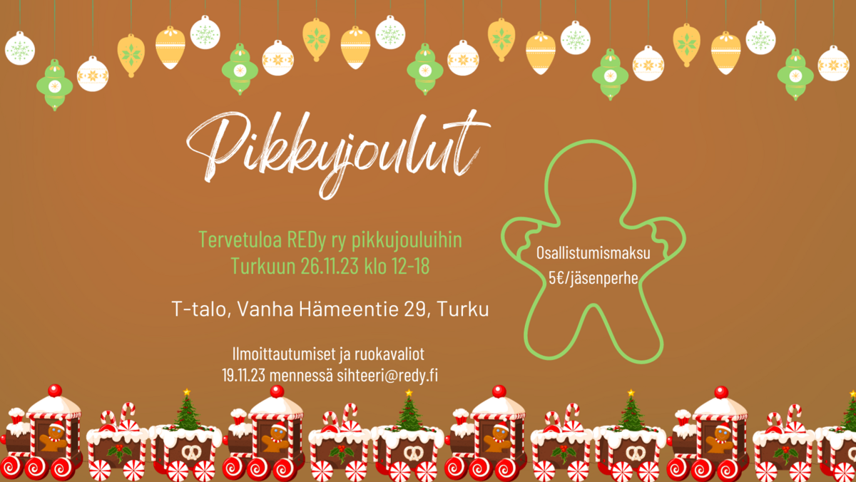 Osallistumismaksu 5€ / jäsenperhe. Muista ilmoittautua ja ilmoittaa erityisruokavaliot 19.11.2023 mennessä osoitteeseen sihteeri@redy.fi