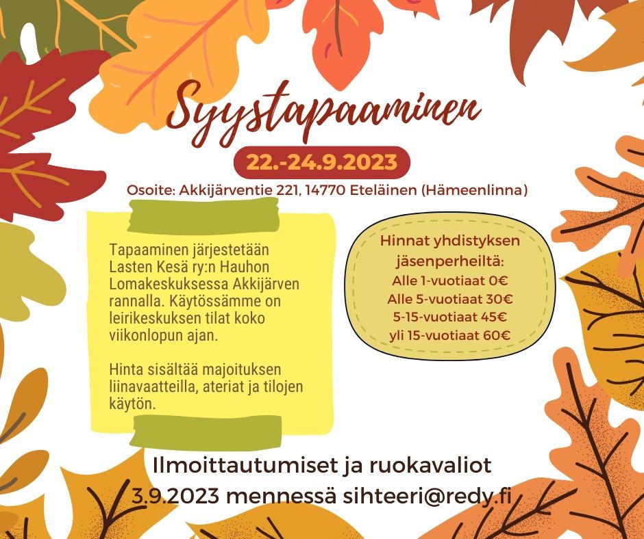 Syystapaaminen järjestetään Lasten Kesä:ryn Hauhon lomakeskuksessa Akkijärven rannalla. Tiedossa on mukavaa yhdessäoloa ja vertaistukea.